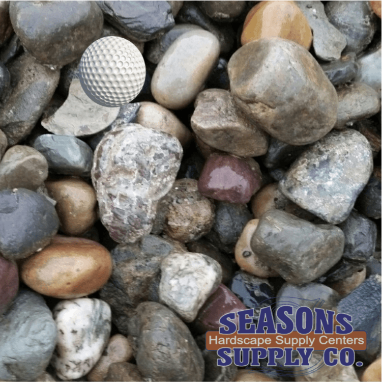 Size Range: 1.5-2" (Golf Ball-Egg)Shape: Mostly RoundedColor: Mostly Grey w/Tans, Reds & BluesUses: Drainage and General LandscapingWater Features & Around Pools Sold By: Cubic Yard